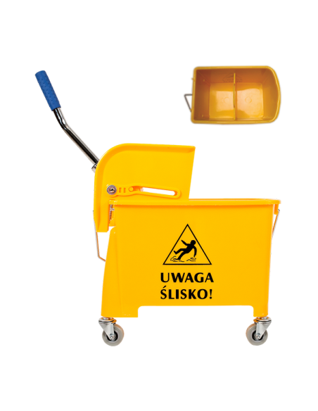 Wózek jednowiaderkowy, o pojemności całkowitej 20 l z prasą, przeznaczony do mycia powierzchni. Wykonany z polipropylenu. Do wiaderka przymocowana jest metalowa rączka umożliwiająca przemieszczanie wózka. Wiadro zawiera ruchomą przegrodę, dzielącą je na 2