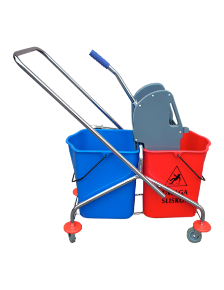 Wózek dwuwiaderkowy o pojemności całkowitej 2 x 23 l z prasą, przeznaczony do mycia powierzchni. Składa się ze stelaża oraz dwóch wiaderek – w kolorze czerwonym i niebieskim. Stelaż wykonany jest ze stali chromowanej, wiaderka – z tworzywa sztucznego PPN.