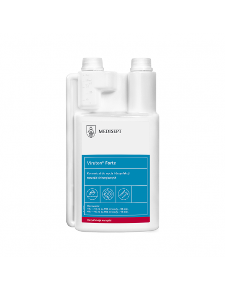 Viruton Forte – wydajny koncentrat przeznaczony jednoczesnej dezynfekcji i mycia instrumentów chirurgicznych i rotacyjnych. Stężenie roztworu już od 1%, posiada właściwości antykorozyjne, produkt nie wymaga użycia aktywatora.
