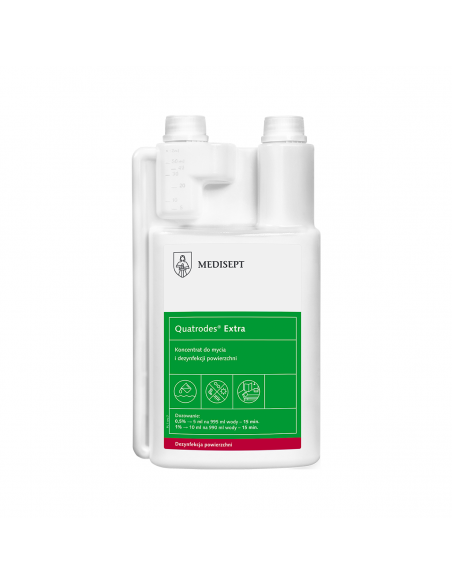 Quatrodes Extra płyn do dezynfekcji firmy Medi-Sept. W swym składzie zawiera surfaktant, który wraz z technologią nanomiceli zapewnia szerokie spektrum działania w krótkim czasie. Szerokie spektrum mikrobójcze już od 0,25%.