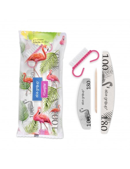 Zestaw został zapakowany w estetyczne, jednorazowe opakowanie. Zestaw zawiera: pilnik100/180, mini polerka 100/180, patyczek i szczoteczka do paznokci