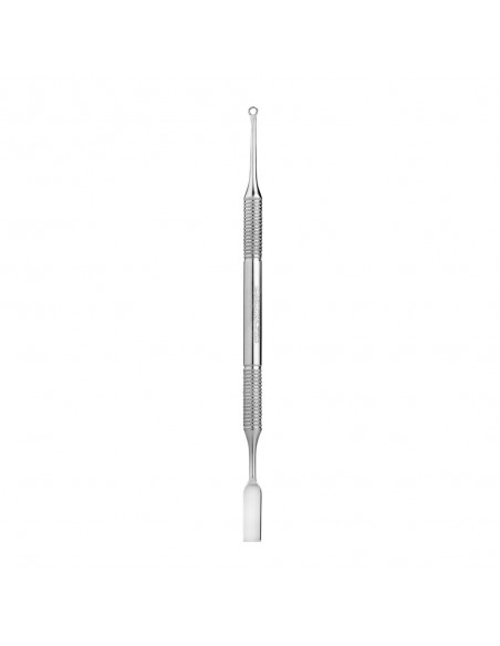 Wyjątkową nowość - dwustronny popychacz PE-51/1. Jedna część narzędzia wykonana jest w postaci prostokątnej łopatki, dzięki której łatwo można przesuwać naskórek.Strona robocza jest umiarkowanie ostra, dzięki czemu dobrze radzi sobie z gęsto rosnącą skórą