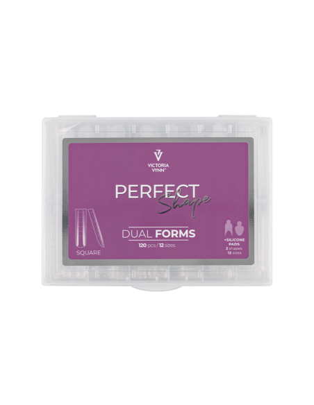 Square - Każde opakowanie PERFECT Shape DUAL FORMS zawiera 120 sztuk foremek w dwunastu rozmiarach, od 0 do 11. Do zestawu dołączone są 2 rodzaje silikonowych szablonów do french manicure.