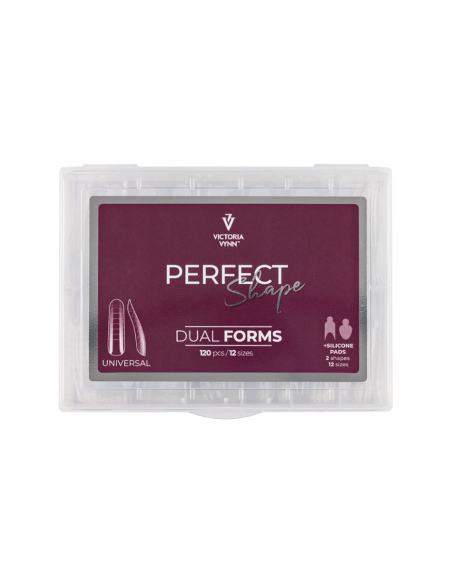 Universlal - Każde opakowanie PERFECT Shape DUAL FORMS zawiera 120 sztuk foremek w dwunastu rozmiarach, od 0 do 11. Do zestawu dołączone są 2 rodzaje silikonowych szablonów do french manicure.
