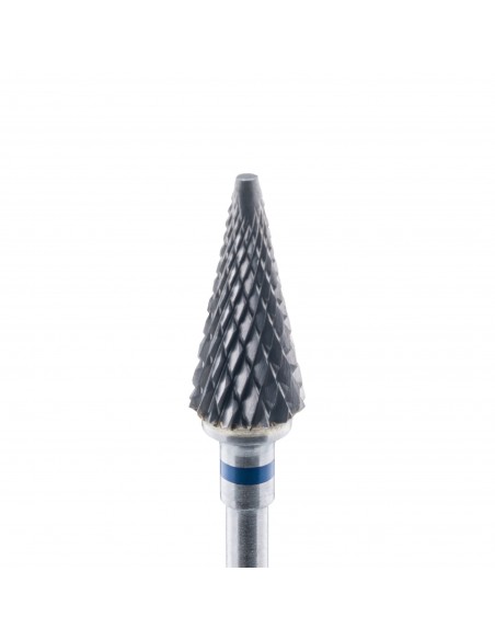 Frez z węglika spiekanego w kształcie ostrego stożka o średnio mocnych nacięciach krzyżowych.