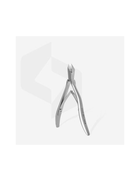 Profesjonalne cążki do cięcia skóry. Długość ostrza 3 mm. Proste krawędzie tnące pod kątem. Część tnąca z występem „piętowym”. Jeden uchwyt o klasycznym kształcie i zakrzywiony uchwyt w kształcie „przecinka”, który dobrze leży w dłoni.