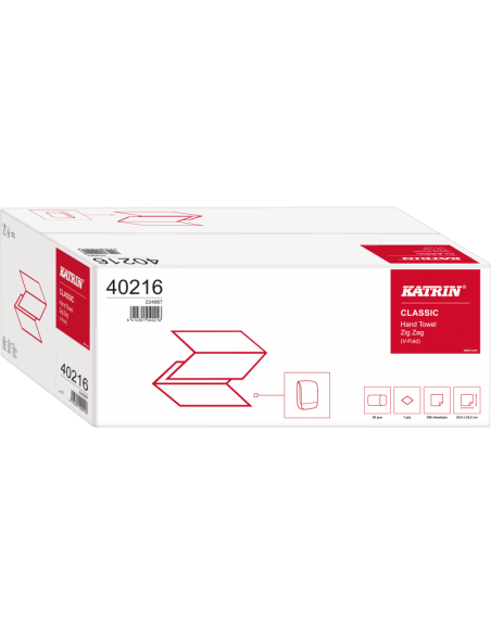 Ręcznik papierowy w składce ZZ Katrin 40216- wysoka absorpcja i wytrzymałość, dozowanie listek po listku. Dopuszczony do bezpośredniego kontaktu z żywnością.dotyku dla dłoni. Wymiar listka: 230 mm x 213 mm