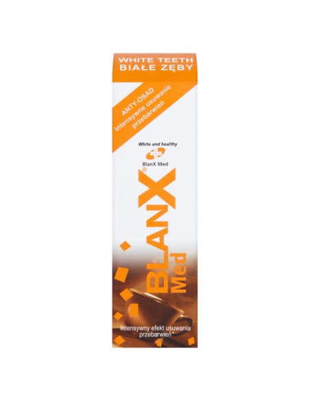 BlanX Anty-Osad Wybielająco-ochronna pasta do zębów na bazie naturalnych wyciągów z porostu islandzkiego. Regularne, codzienne stosowanie pasty pozwala usunąć osady po kawie, papierosach oraz przebarwienia zębów. By Twoje zęby były zawsze białe.