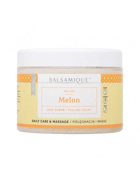 Peeling solny o zapachu melona dokładnie usuwa martwy naskórek i pomaga utrzymać zdrowy wygląd skóry po zabiegu. Receptura łączy oczyszczające i eksfoliujące działanie gruboziarnistej soli z wyrównującym koloryt ekstraktem marchwi.