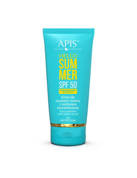 Apis Hello Summer Krem do opalania twarzy z nektarem komórkowym SPF50 Krem dzięki swojej nowoczesnej formule szybko się wchłania. Znajdujące się w składzie kremu mineralne filtry UVA/UVB (SPF50) zapewniają skuteczną ochronę