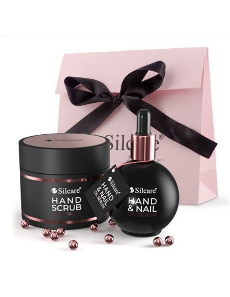 Zestaw do pielęgnacji dłoni i paznokci w ozdobnej, prezentowej torebce składa się z jedwabnej pasty peelingującej 150ml i serum olejkowego 75ml. Ten elegancki duet w odcieniach różowego złota zadba o Twoją skórę i paznokcie.