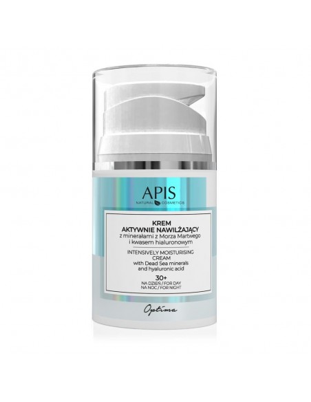 Krem aktywnie nawilżający z minerałami z Morza Martwego i kwasem hialuronowym Apis Optima, poj. 50 ml, mineralny krem dla każdego rodzaju cery powyżej 30 roku życia. Pielęgnacja przeciwstarzeniowa na dzień i na noc.