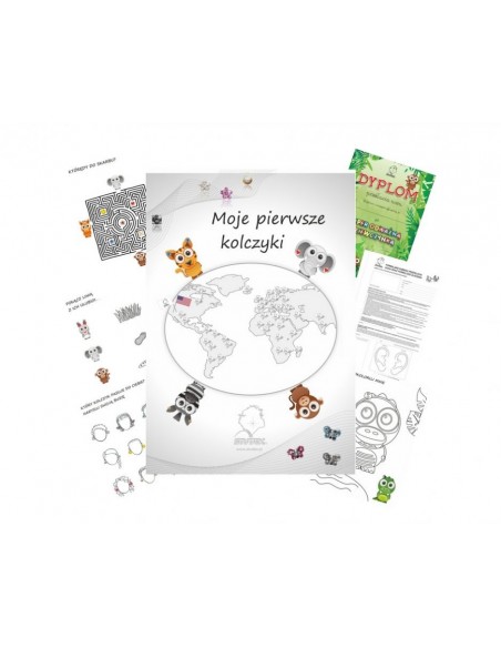 Książeczka A4 - "Moje pierwsze kolczyki" zawiera: formularz zlecenia zabiegu przekłucia uszu kolorowanki zabawy i łamigłówki dyplom przekłucia uszu