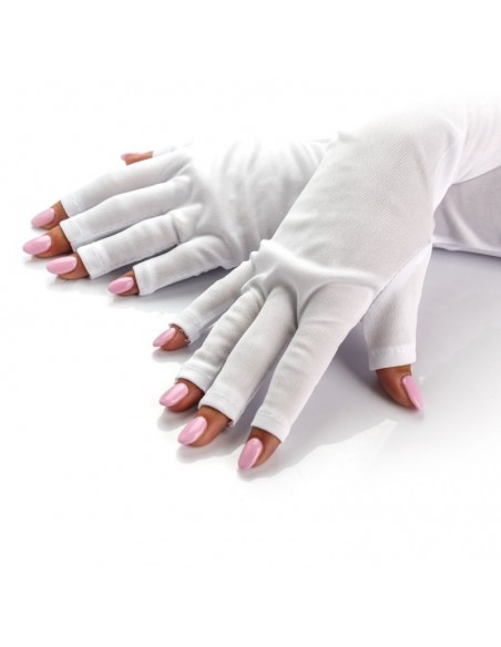 Rękawiczki ochronne zabezpieczą je przed wpływem promieniowania UV podczas utwardzania paznokci. Długie, wykonane z poliestru, odsłaniają same końcówki palców, dzięki czemu światło UV działa jedynie na paznokcie i opuszki.