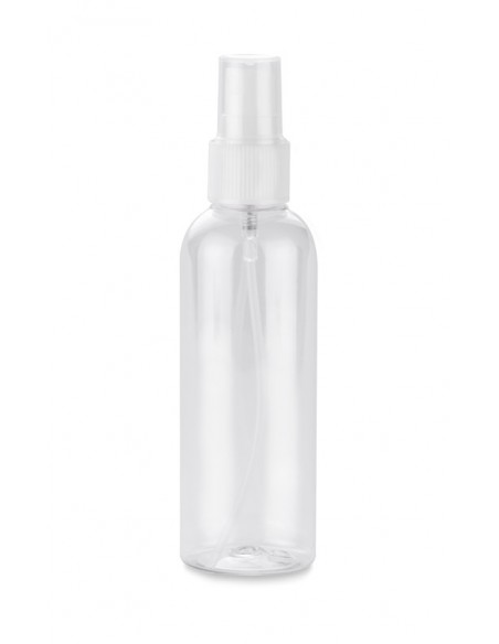 Pojemnik ze spryskiwaczem, spray'em, atomizerem. Wykonany z plastiku półprzezroczystego.