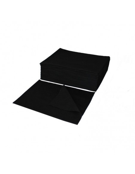 Ręcznik z włókniny perforowanej czarny o wymiarze 70 cm na 40 cm pakowane w folię po 100 sztuk.