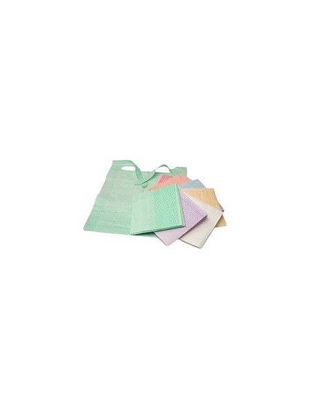 Jednorazowe, dwuwarstwowe, śliniaki stomatologiczne z kieszenią, wykonane z chłonnej bibuły oraz folii polietylenowej, zabezpieczającej przed przemakaniem produktu.