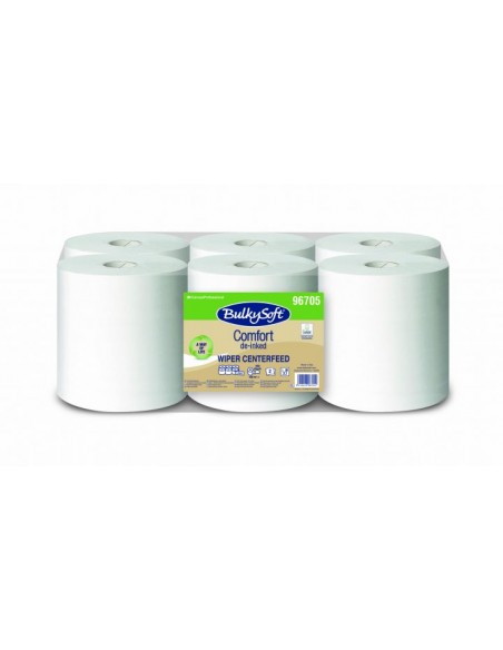 Ręczniki papierowe w roli centralnego dozowania Bulkysoft. Rolka ma długość 108 m i podzielona jest na 450 odcinków równej długości po 20 cm.