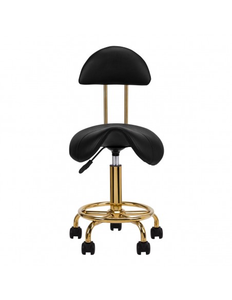 Wygodny, stabilny taboret kosmetyczny z oparciem, z profilowanym siedziskiem, elementy metalowe w kolorze złotym. Na pięcioramiennej podstawie z plastikowymi kółkami. Dostępny w kolorze czarnym, niezbędny mebel w gabinecie kosmetycznym.