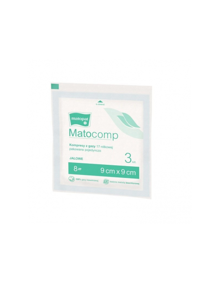 Kompresy z gazy Matocomp jałowe zapakowane zostały w papierowo-papierowe opakowanie zbiorcze, w którym znajdują się kompresy pakowane indywidualnie, sterylnie w papierowe opakowania.