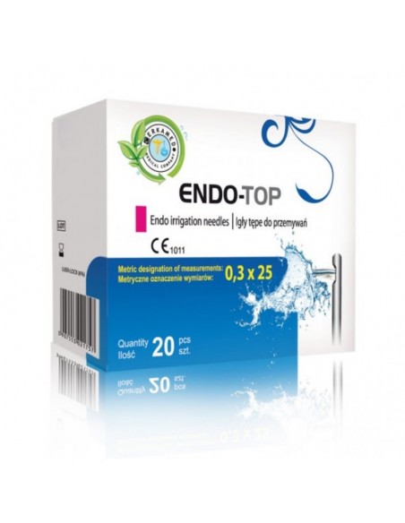 ENDO-TOP to tępe igły z bocznym otworem do przemywań kanałów korzeniowych i kieszonek dziąsłowych. Nieostry, zaokrąglony szczyt igły gwarantuje bezpieczeństwo użytkowania i niweluje ryzyko przypadkowego uszkodzenia tkanek.