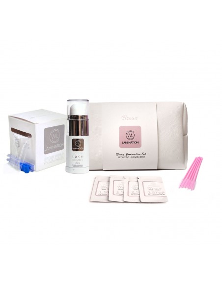 Zestaw do laminacji Brwi zawiera: 1. Lifting Lotion 1ml x 2 saszetki 2. Setting Lotion 1ml x 2 saszetki 3.Vitamin Lash&Brow Bomb 20 ml x 1 sztuka 4. Brow Wrap 5. Szczoteczka do brwi - 5 sztuk.