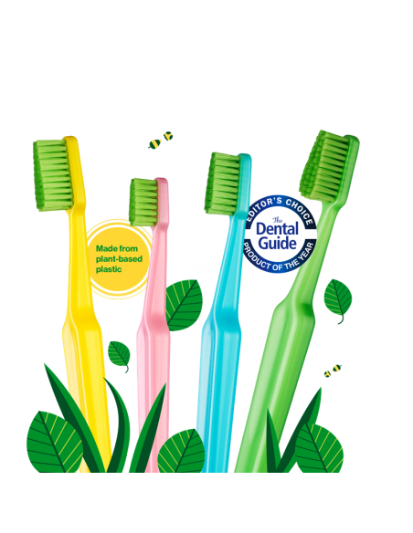 Przyjazna dla środowiska szczoteczka do zębów TePe GOOD Regular przeznaczona dla dorosłych, wyprodukowana z odnawialnych źródeł surowców. Rączkę tworzy bioplastik pochodzący z trzciny cukrowej, a drobne włókna są z oleju rycynowego.