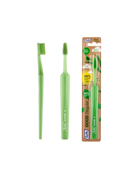 Przyjazna dla środowiska szczoteczka do zębów TePe GOOD Regular przeznaczona dla dzieci od 3 lat albo dorosłych, którzy preferują mniejszą główke szczoteczki. Rączkę tworzy bioplastik pochodzący z trzciny cukrowej, a drobne włókna są z oleju rycynowego.