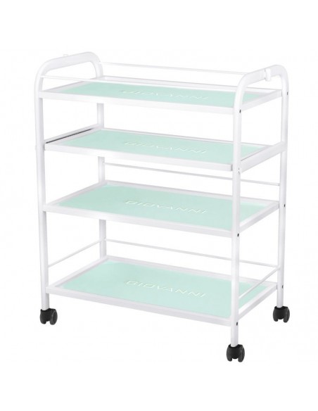 Funkcjonalny, metalowo-szklany stolik z kółkami i wysuwaną jedną półką. Ten stabilny mebel idealnie sprawdza się jako stolik pod urządzenia kosmetyczne. Posiada możliwość zamocowania lampy lupy oraz innych elementów.Stolik posiada cztery szklane półki.