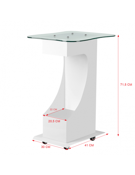Funkcjonalny, metalowo-szklany stolik z gumowymi kółkami z funkcją blokady. Iidealnie sprawdza się jako stolik pod urządzenie kosmetyczne.