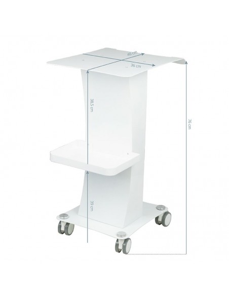 Funkcjonalny, metalowy stolik z gumowymi kółkami z funkcją blokady. Iidealnie sprawdza się jako stolik pod urządzenie kosmetyczne. Posiada stabilną półkę na urządzenie oraz drugą na akcesoria a dzięki kółką stolik jest mobilny i łatwy do przesuwania.